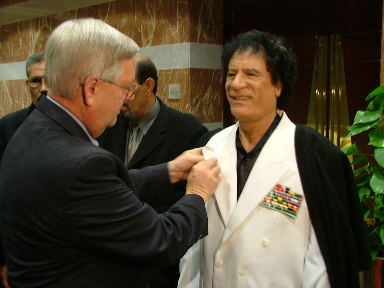 President Ronald Reagan called Qaddafi the "Mad Dog of Tripoli" in this interchange with columnist Helen Thomas. The A-85 Intruder Association weblog entries for March 24-25, To get a sense of the high tension of these engagements, readers can listen to an actual audio exchange between AWACS flight controllers and two F-14 pilots as they engage Libyan MiG-23 Flankers. p34: PHOTO: Qaddafi whispered to his chief of staff, who then pointed to the pin Rep. Curt Weldon was wearing with the American and green Libyan flag intertwined. "Pin it on him," he told Weldon. Chapter 2: The Making of an Ambassador