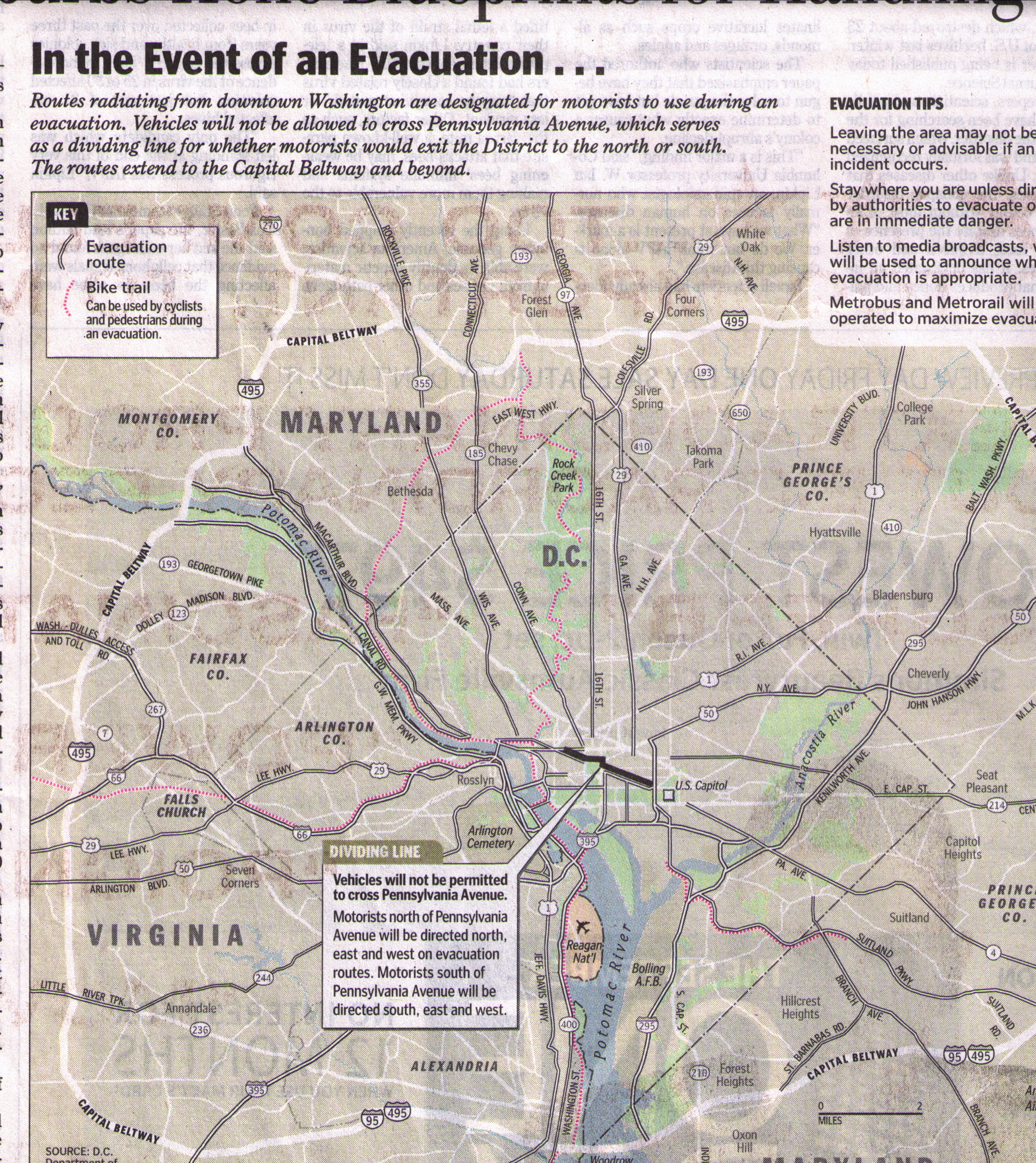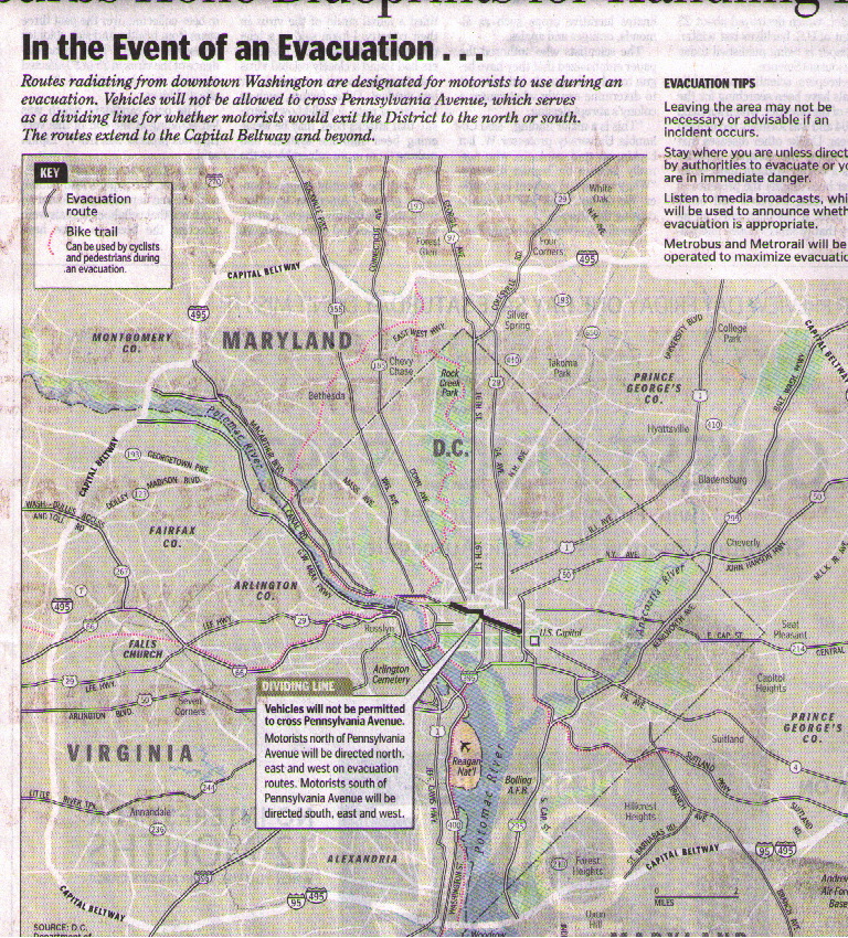 Question: Chaplain Duncan O'Garrity leads the crowd on the National Mall in prayer during the final, climatic scenes of the book. What can ordinary citizens do in the event of a nuclear attack? Answer: A lot. Most estimates place the kill radius of a small nuclear explosion in a city such as Washington, DC just two to three miles. Here's an Internet tool to calculate overpressure zones (set the bomb blast to 20 KT - about the size of the Hiroshima bomb and the likely size of a terrorist bomb) As those of us who were brought up in the 1960s recall, the key is "duck and cover" - or better yet, get underground and stay put until civil defense radio stations sound the all clear. Here's a good backgrounder on radiation detectors available to the public. The last FEMA guide on surviving nuclear attack was published in 1997. Newsmax put out an excellent 1-2-3 of nuclear survival in 2002, and offers a terrific World Band radio equipped with a hand crank as a bonus to new subscribers. Here's a more recent Internet guide to survival by a vendor of radiation detectors and other gear. Bottom line is: don't panic, and don't give up. And here's a map, from the Sept. 7, 2007 edition of the Washington Post, you can use to track the events of the final scenes of the book (Ssshht!). I've also prepared a printable version should you need it (3.8 mb jpeg file), which you can download here. |