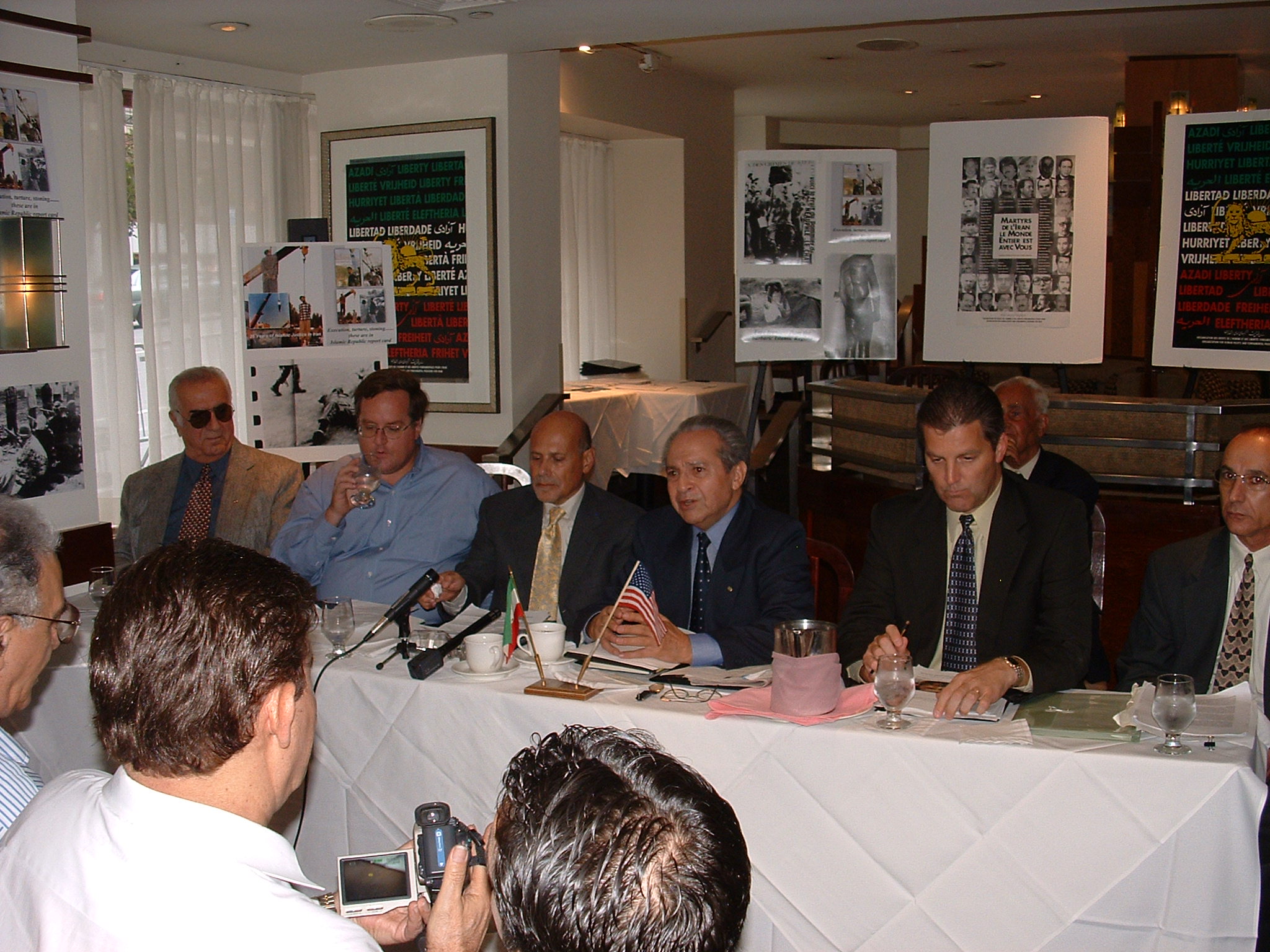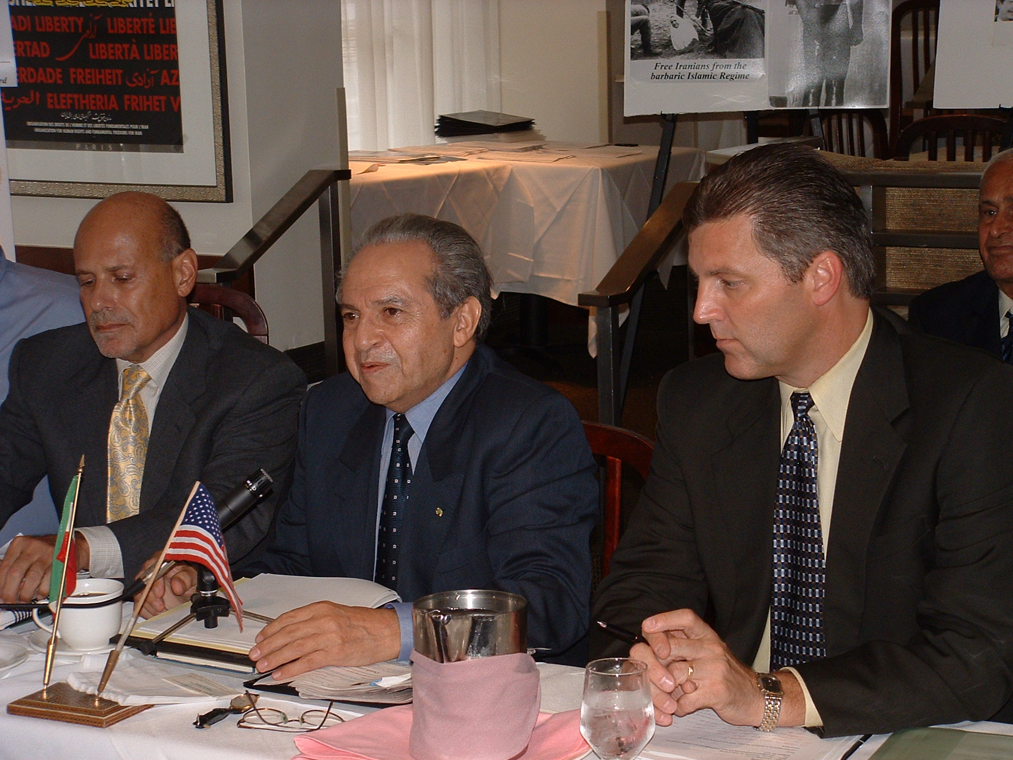 Dr. Manoucher Ganji presentsformer U.S. hostages and victims of Islamic Republic of Irantorture in New York on Sept. 14 From left to right: JosephPirayoff, Bob Moore, son of former hostage Bert Moore (now deceased),Barry Rosen, Dr. Ganji, Kevn Hermening, and Dr. Morteza Esfandiari, U.S. representative of the Kurdish Democratic Party of Iran.